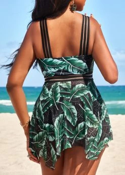 Patchwork Tropical Plants Print Blackish Green Swimdress Set