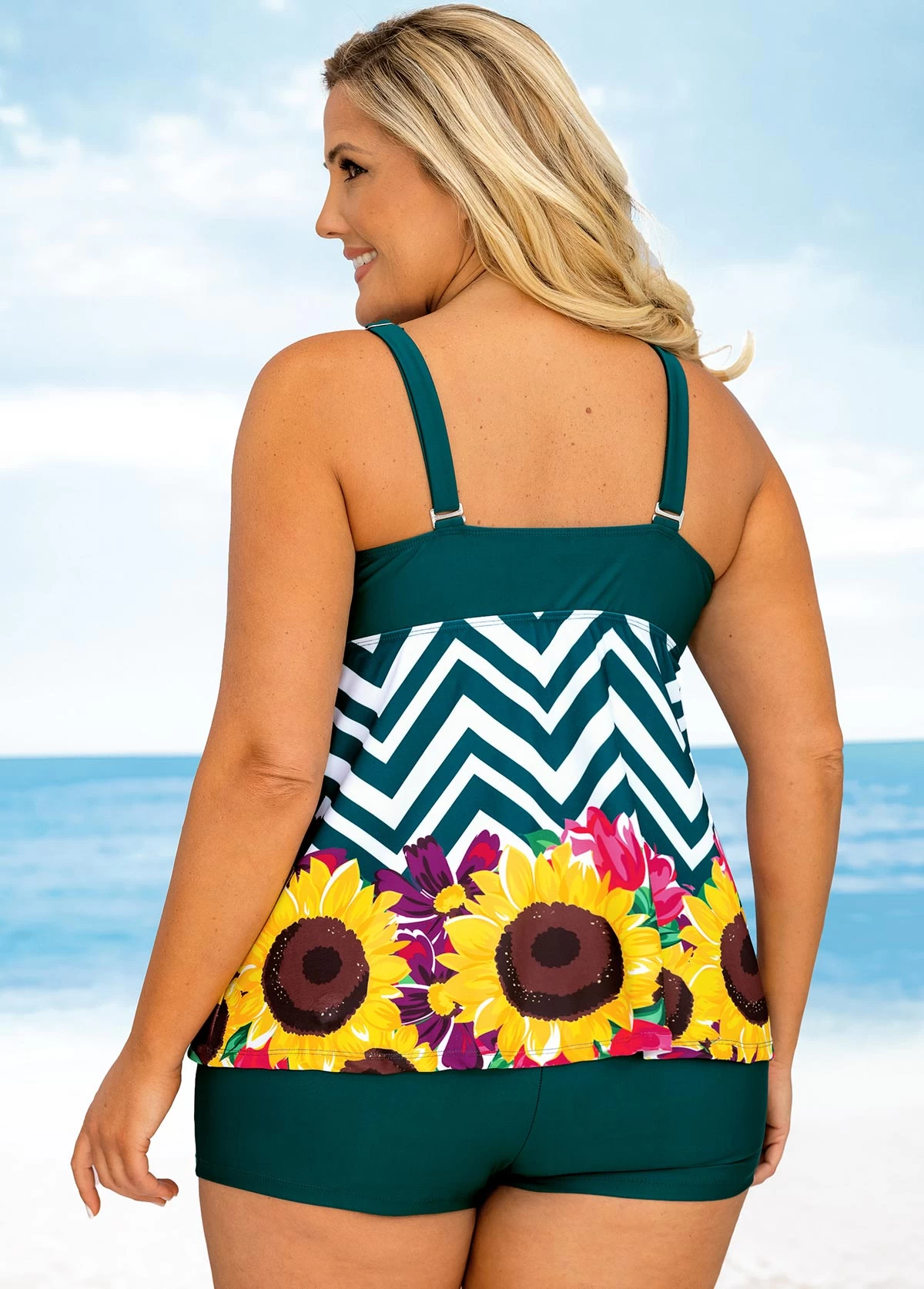 Plus Size Floral And Chevron Print Wide Strap Tankini Set