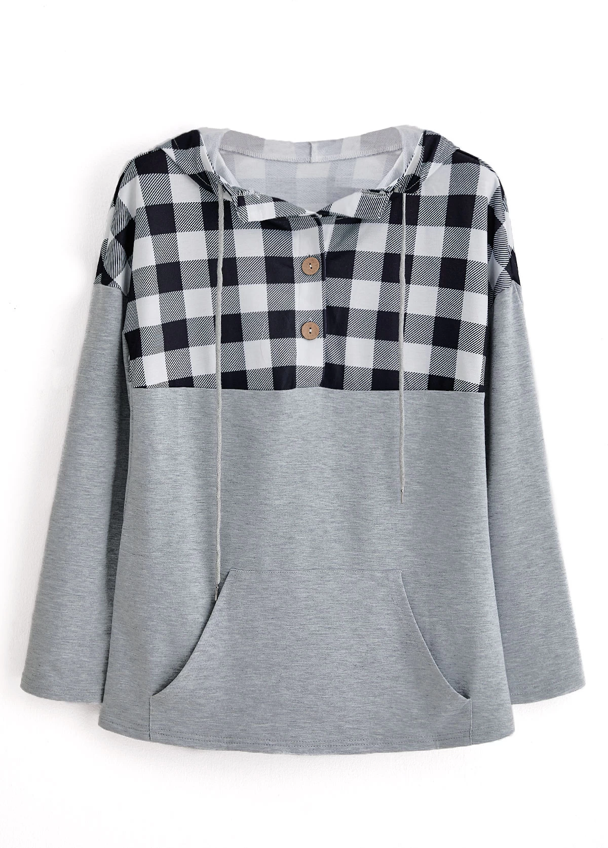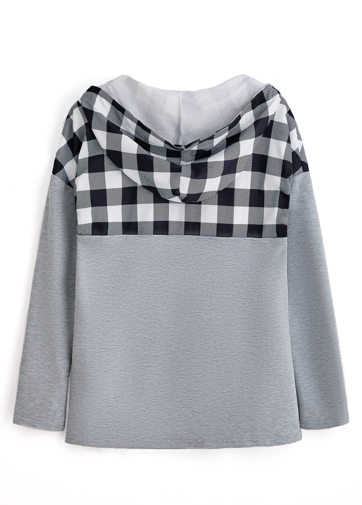 Plus Size Grey Pocket Plaid Long Sleeve Hoodie
