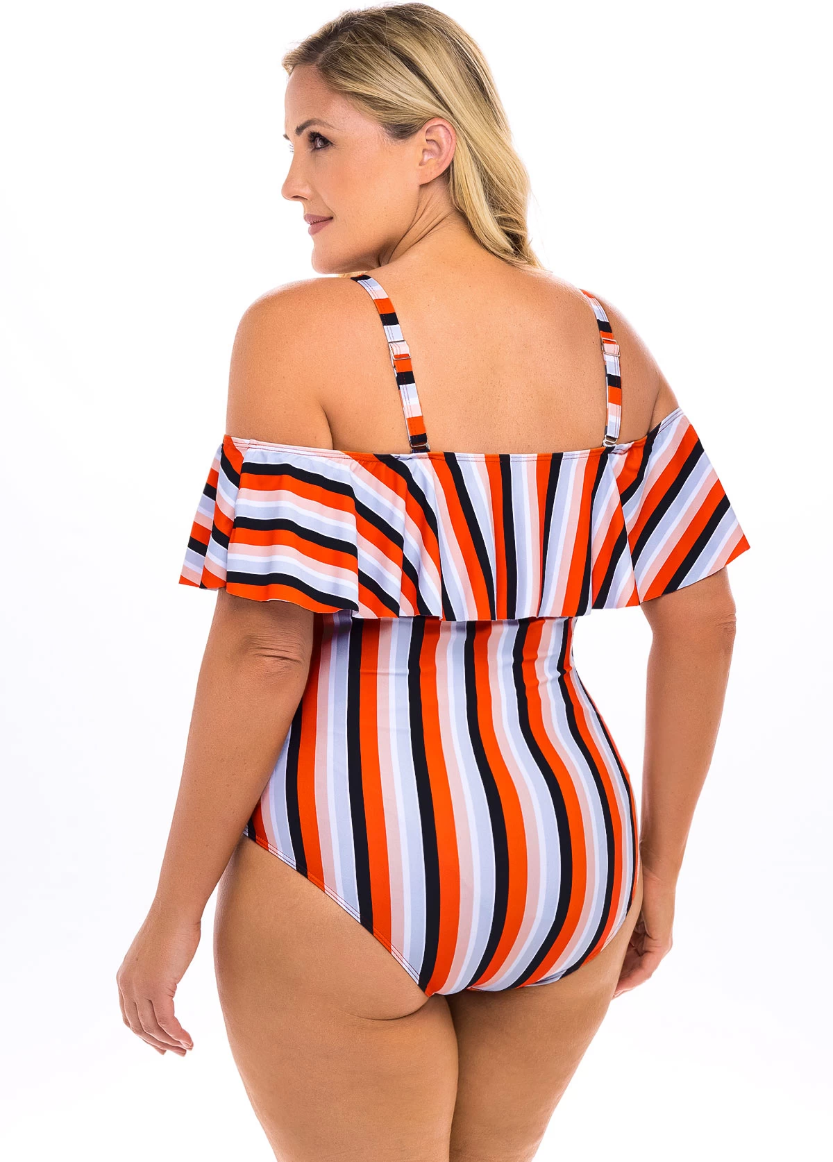 Plus Size Striped Cold Shoulder One Piece Swimwear