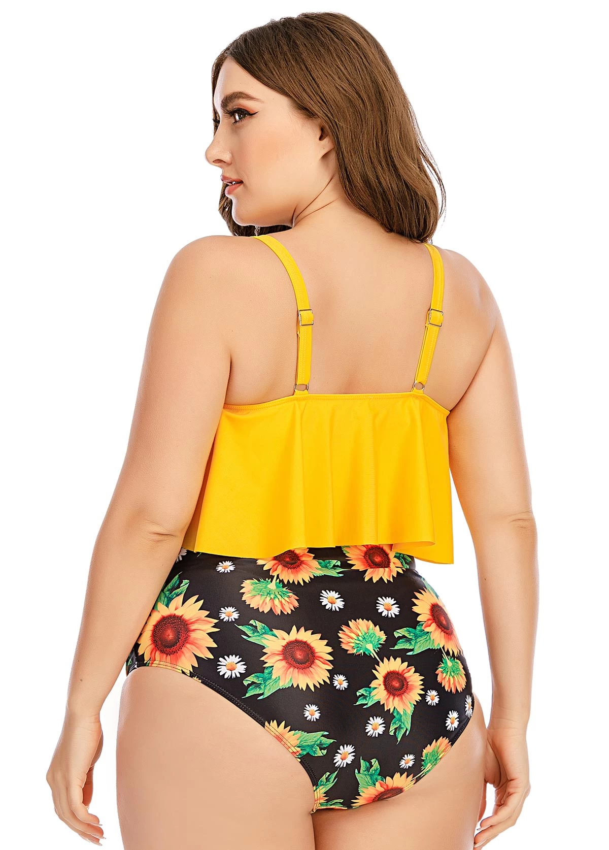 Plus Size Sunflower Print Asymmetric Hem Bikini Set