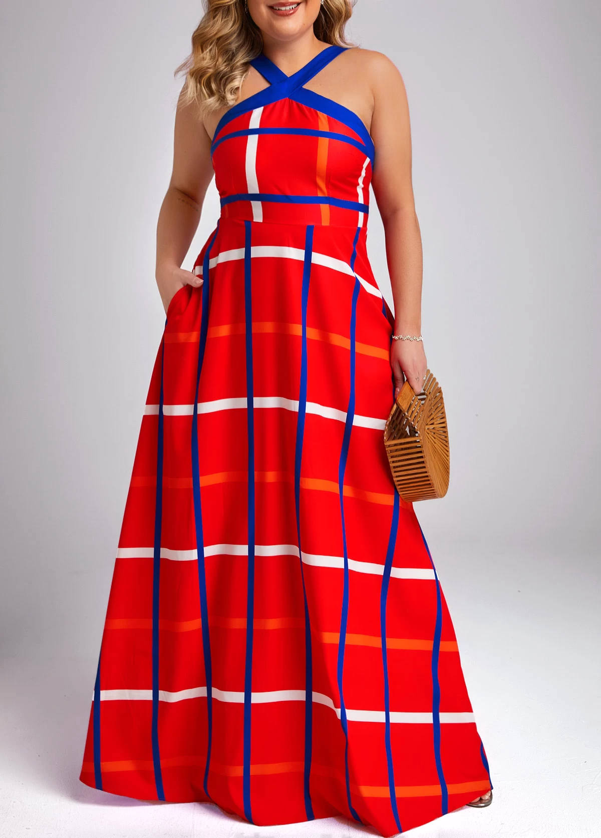Red Pocket Plus Size Plaid Sleeveless Maxi Dress